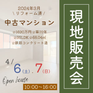 2024年4月6日(土)7日(日)にてリフォーム済中古マンションの現地販売会を開催いたします! \ 2024年3月リフォーム完了 /価格■𝟭𝟲𝟵𝟬万円(税込)専有面積■𝟲𝟴.𝟬𝟰㎡間取り■𝟯𝗦𝗟𝗗𝗞構造■鉄筋コンクリート […]