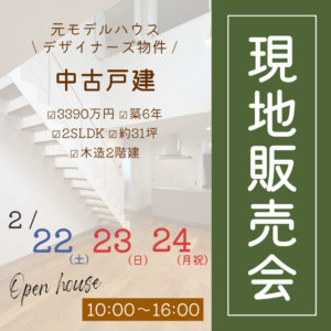2025年2月22日(土)23(日)24(月祝)にてデザイナーズ中古戸建の現地販売会を開催いたします! \ 2018年8月新築 元モデルルーム /価格■3,390万円(税込)専有面積■約31坪間取り■2SLDK構造■木造 […]