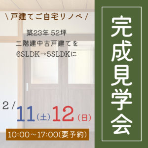 2023年2月11日(土)12日(日)にて戸建てご自宅リノベの完成見学会を開催いたします! 見どころ① ☑和室を2部屋繋げた19帖のLDK☑おじいさまが1階で全て完結できる間取り☑南向きを活かした畳スペースとサンルーム […]