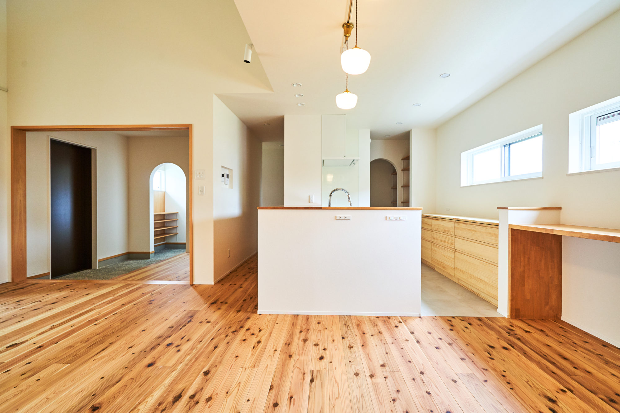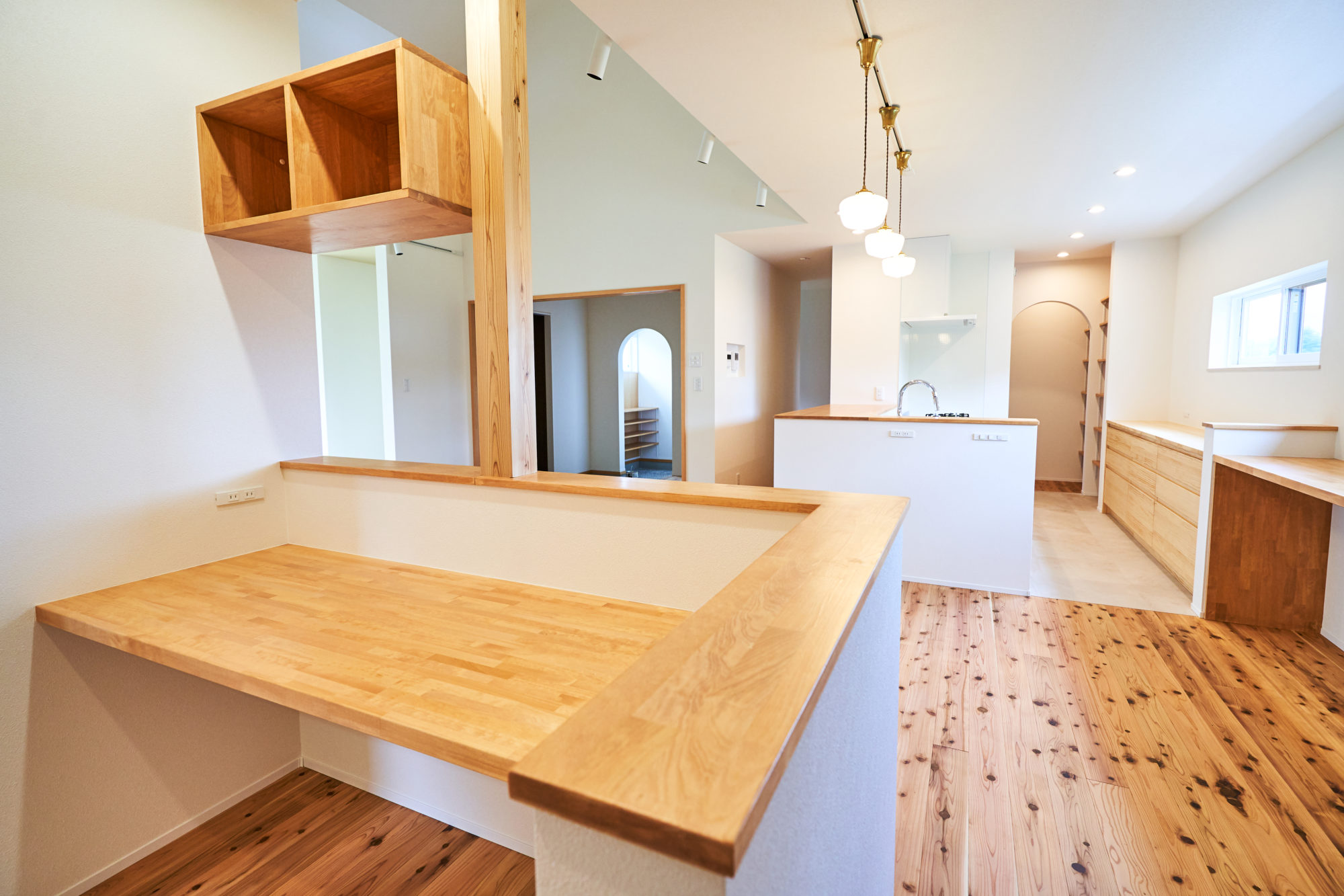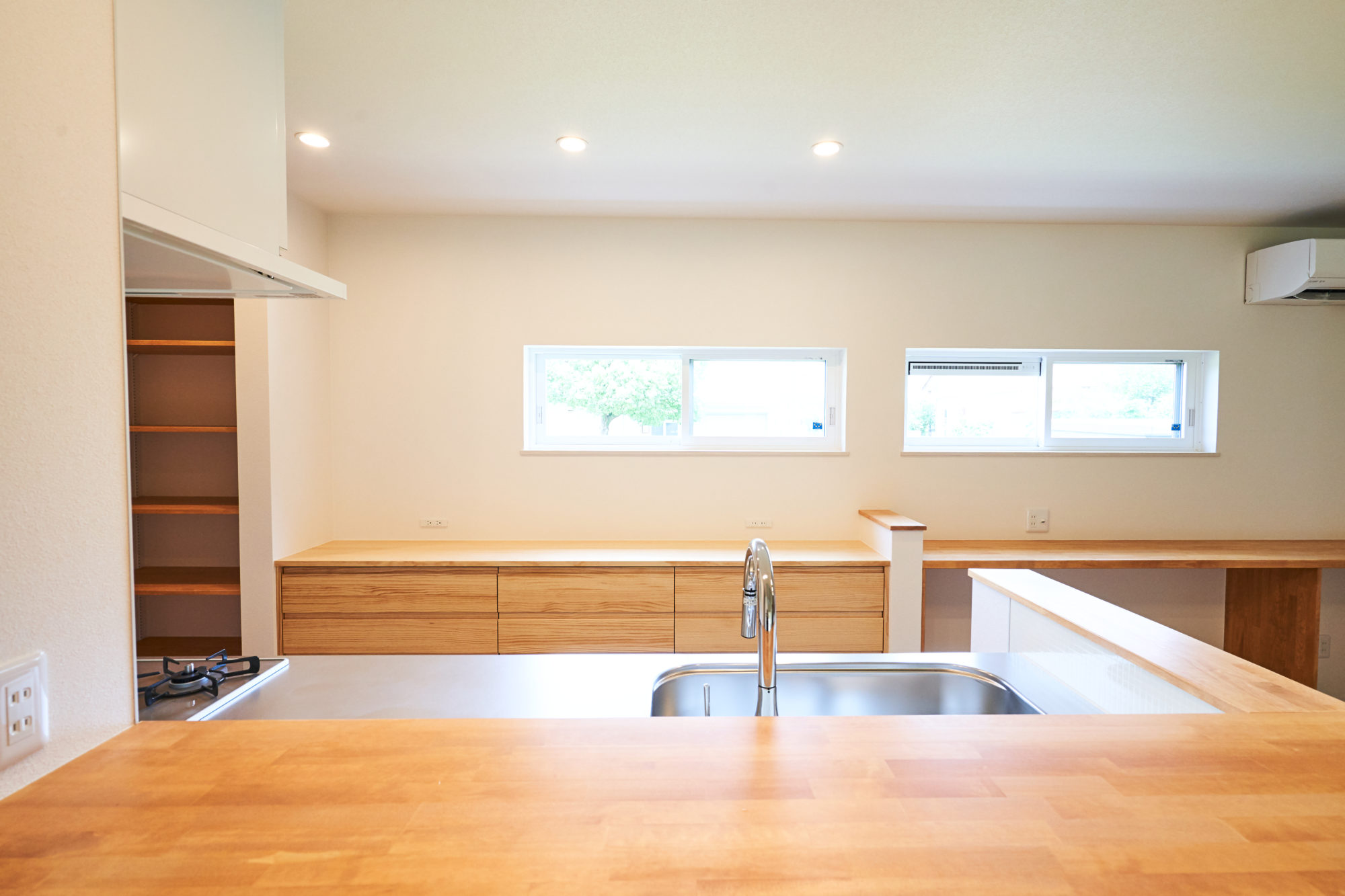 やわらかな光が差し込むキッチン。高さをそろえたキッチン収納とカウンターは、スッキリとした印象でインテリアの邪魔をしません。食器や家電を「見せる」収納で自分好みにコーディネートできます。