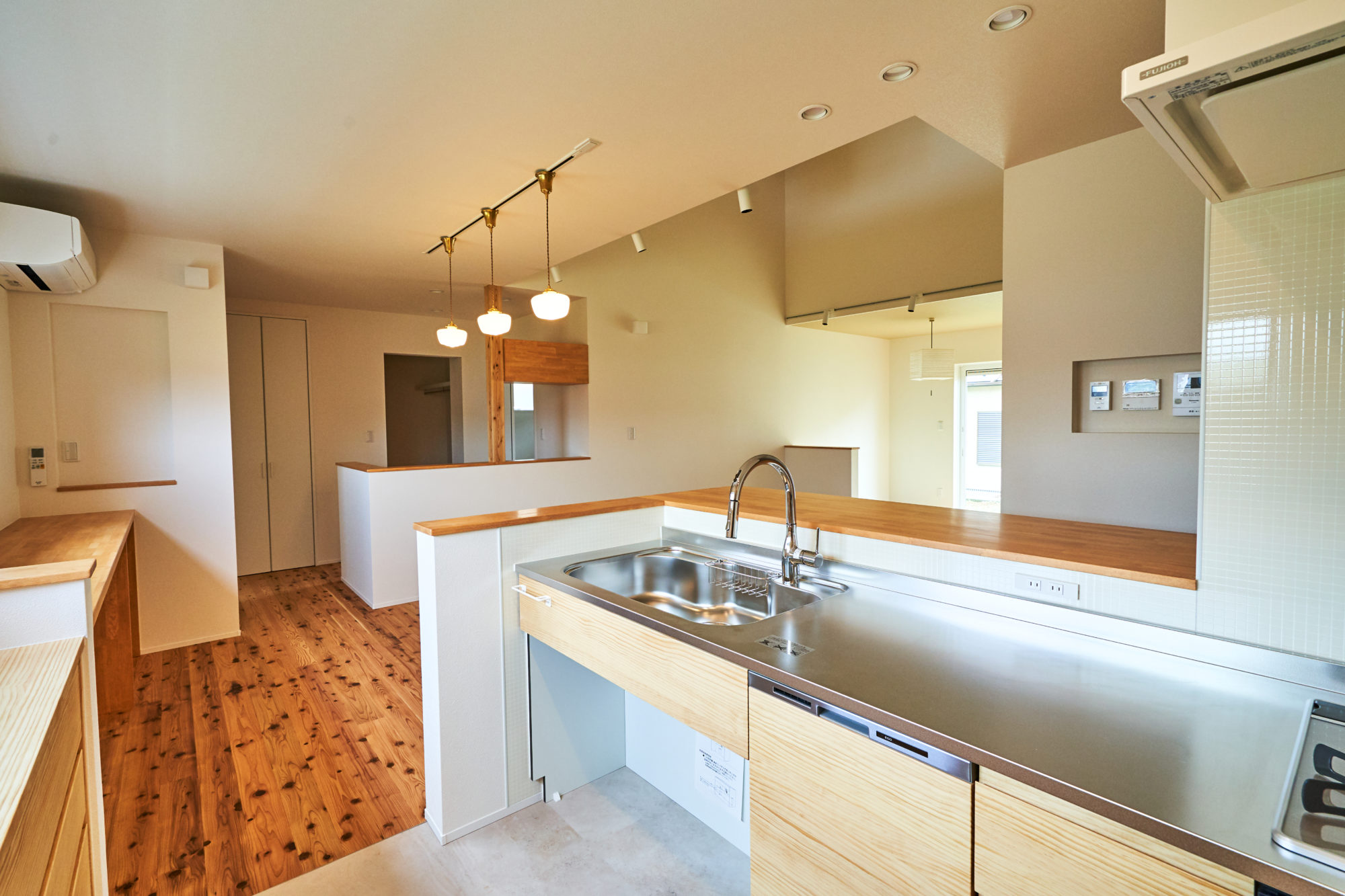 自然の木から成る無垢材は、保温性や断熱性が高く適度に柔らかいので裸足で木のぬくもりを感じることができます。さらに「無垢の木のキッチン」を採用し、家全体で木のぬくもりを感じながら心地よく暮らせます。