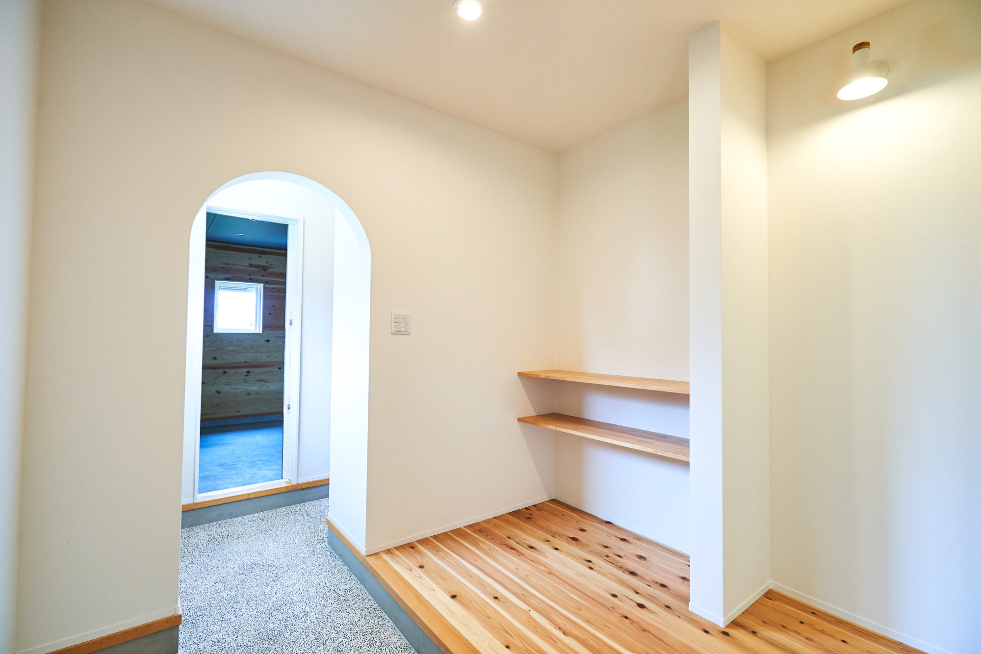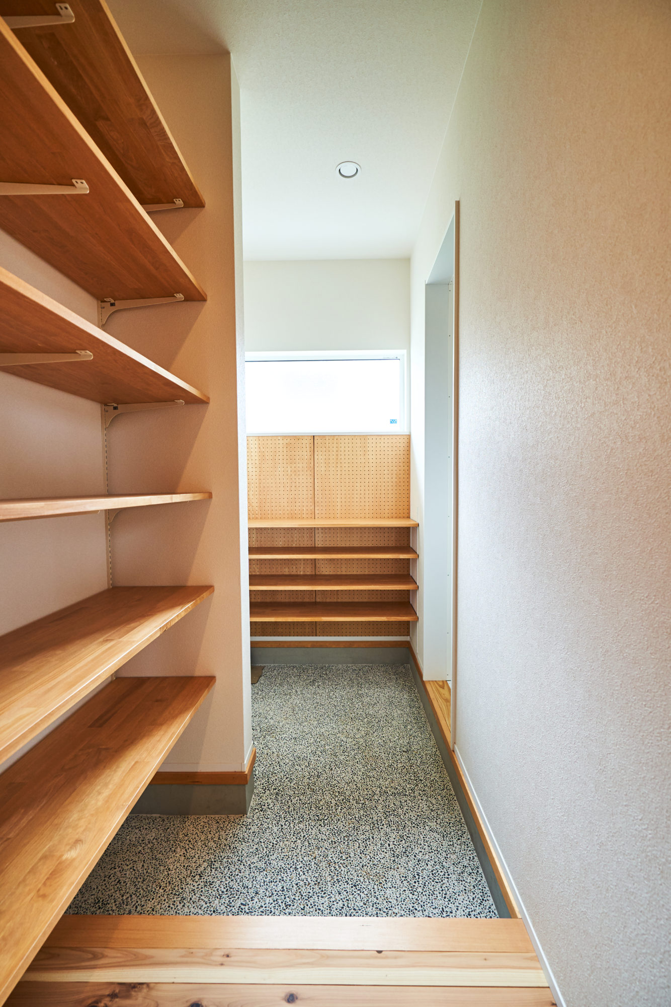 さらに、帰宅導線を2wayにすることで、買い物帰りは冷蔵庫へ直行!重い荷物も最短ルートで収納できます。リビングからは冷蔵庫を隠し生活感が出ないように設計し、インテリアの邪魔をせずスッキリとした印象になりました。