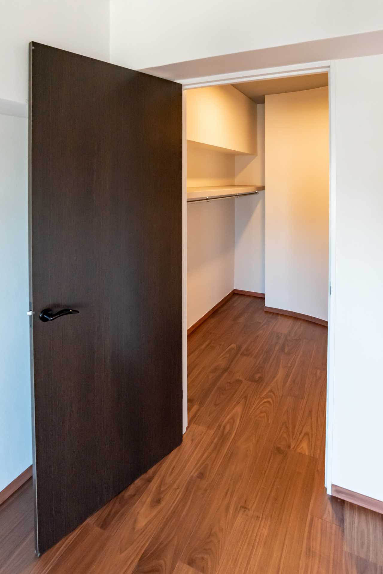 リビングへ繋がる廊下部分には緩やかな曲線を描いた壁を。壁の内側はウォークインクローゼット。