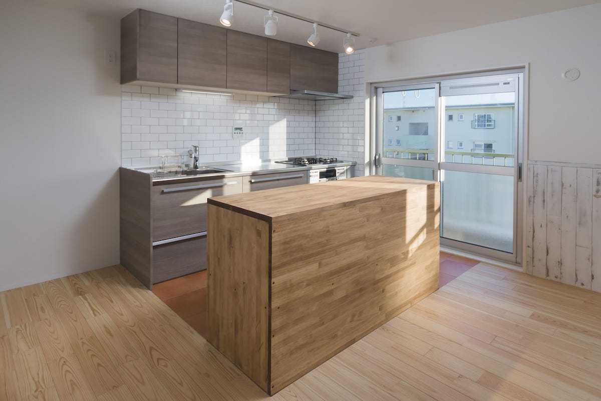 他にもアイランドキッチンが映えるインダストリアルなパネルを使用し、照明もダウンライトとスポットライトを使い、部屋全体の明暗でアクセント。