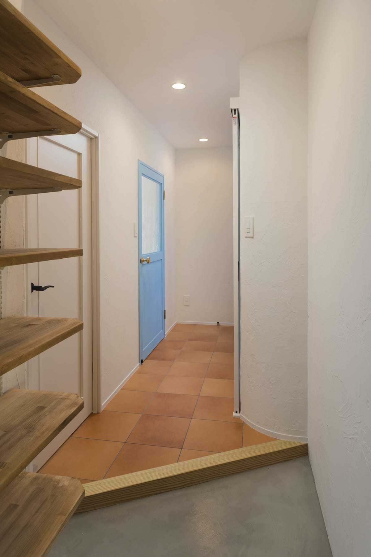 開放的なリビングに、ワンポイントが映えるカラーの扉をトッピング。一つはサファイヤブルーの扉とドアではない開放的なデザインの見えないトビラ。