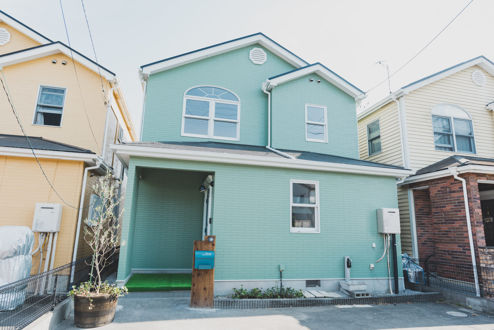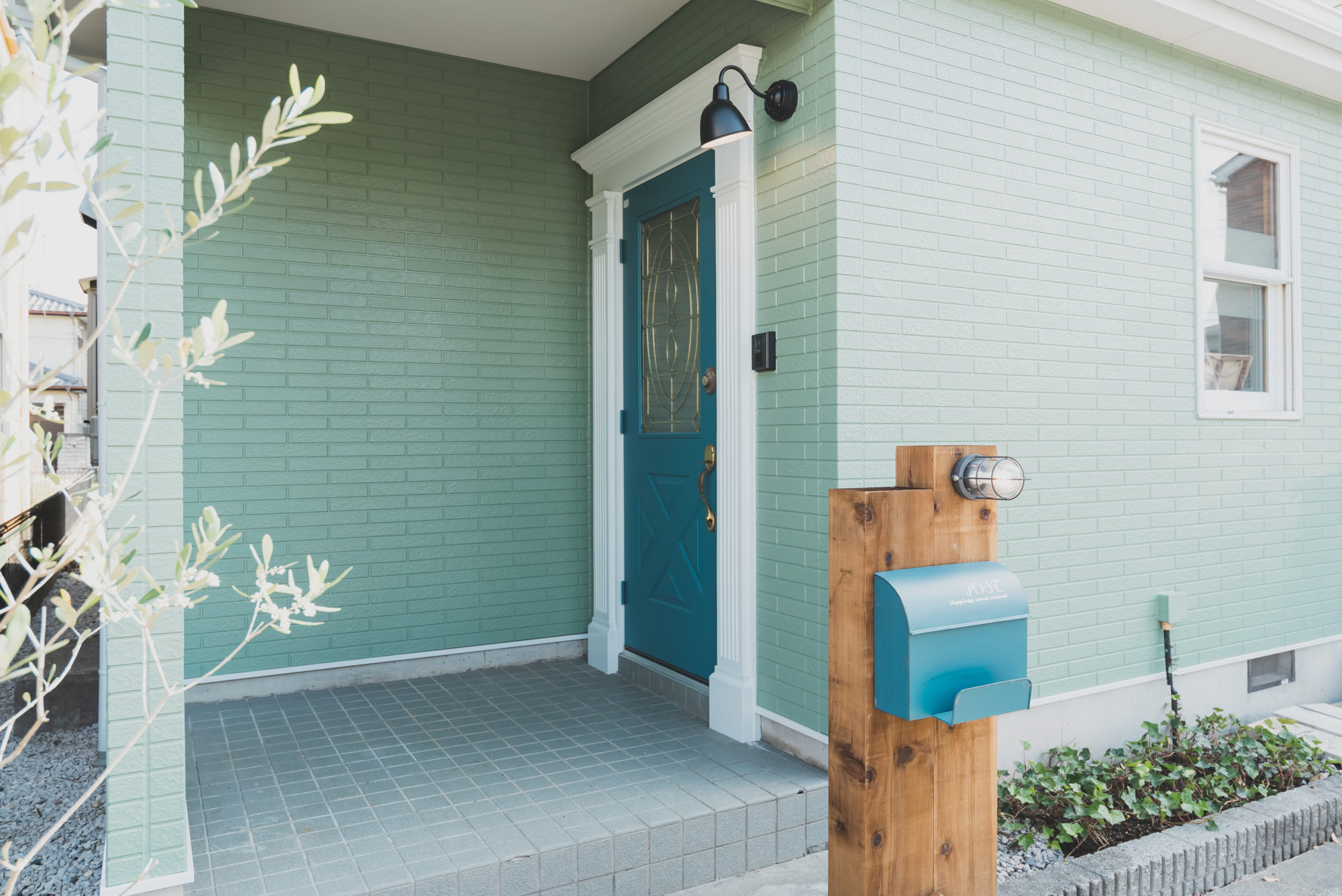 外壁と玄関ドアも鮮やかなグリーン系で統一。ヴィンテージ感を大切に、門柱とポスト、照明も新しく設置しました。