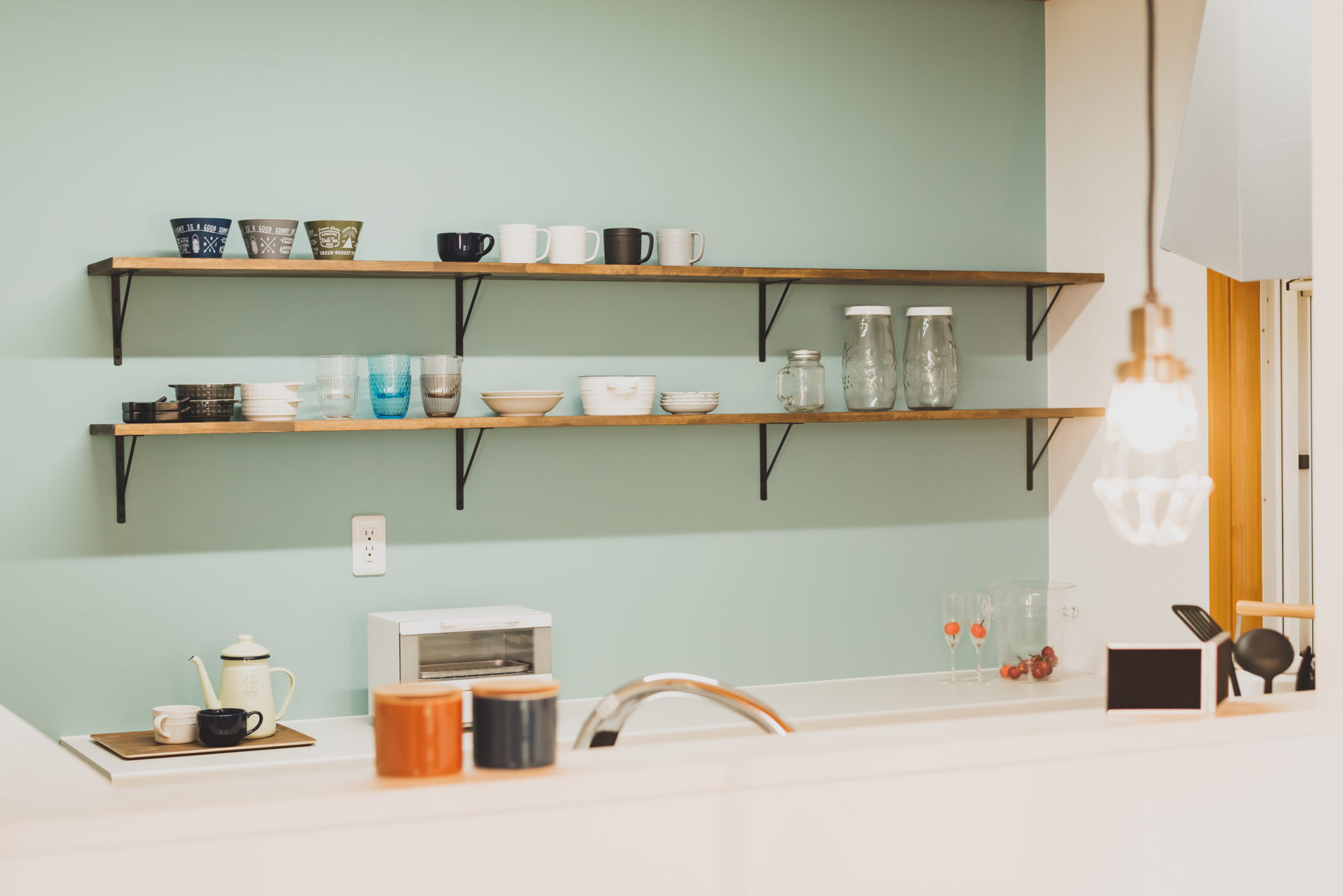 キッチン背面には、淡いミントグリーンのアクセントクロスを採用。そこに造作の収納棚を設置しました。お気に入りの食器を飾ってもおしゃれです。