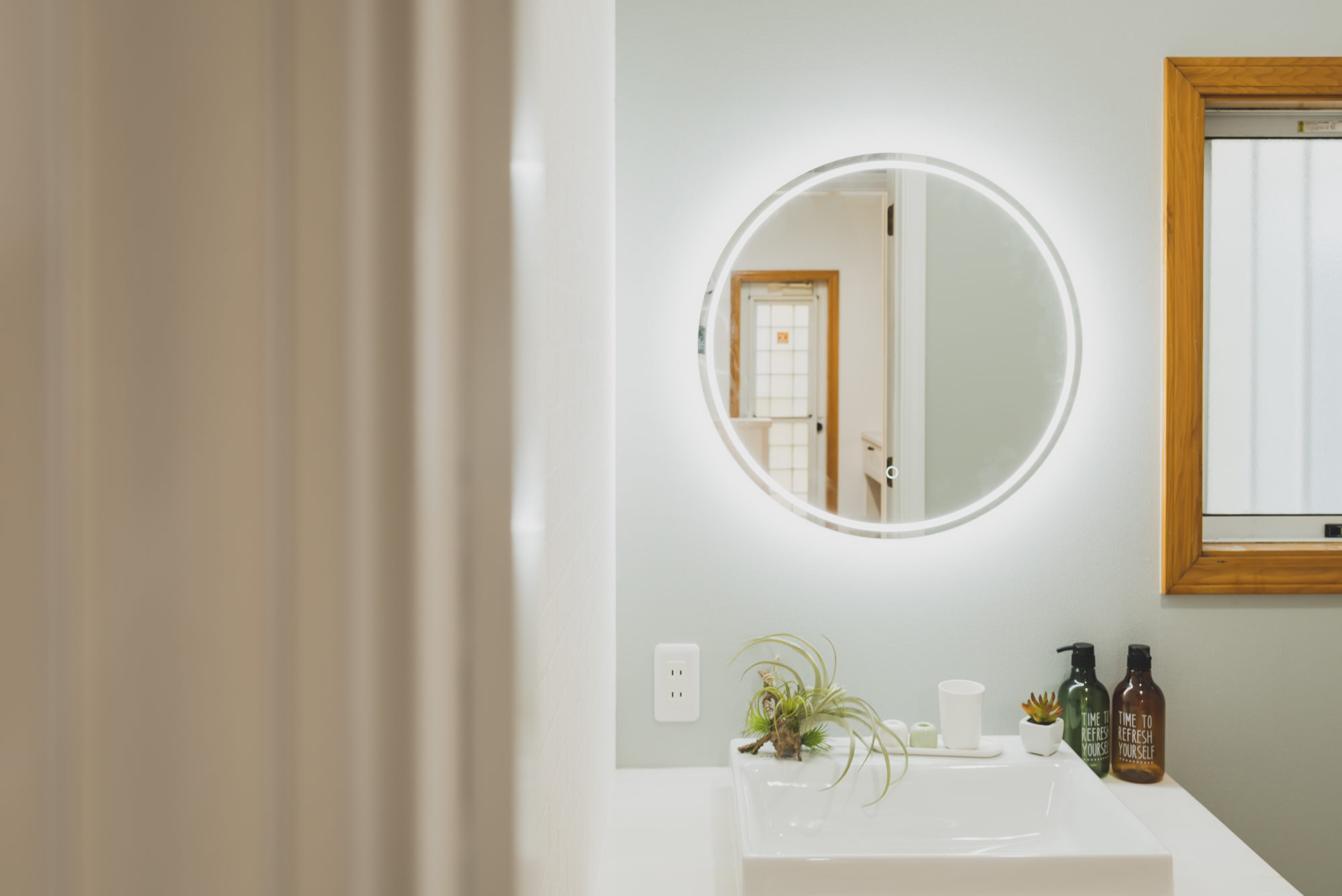 洗面所の鏡もこだわったポイント。女性に人気のライティングミラーを設置し、毎日のお肌のお手入れが楽しみになる仕掛け。トイレは極力シンプルに。造作した棚は長さがあるので、収納棚兼飾り棚として十分使えます。