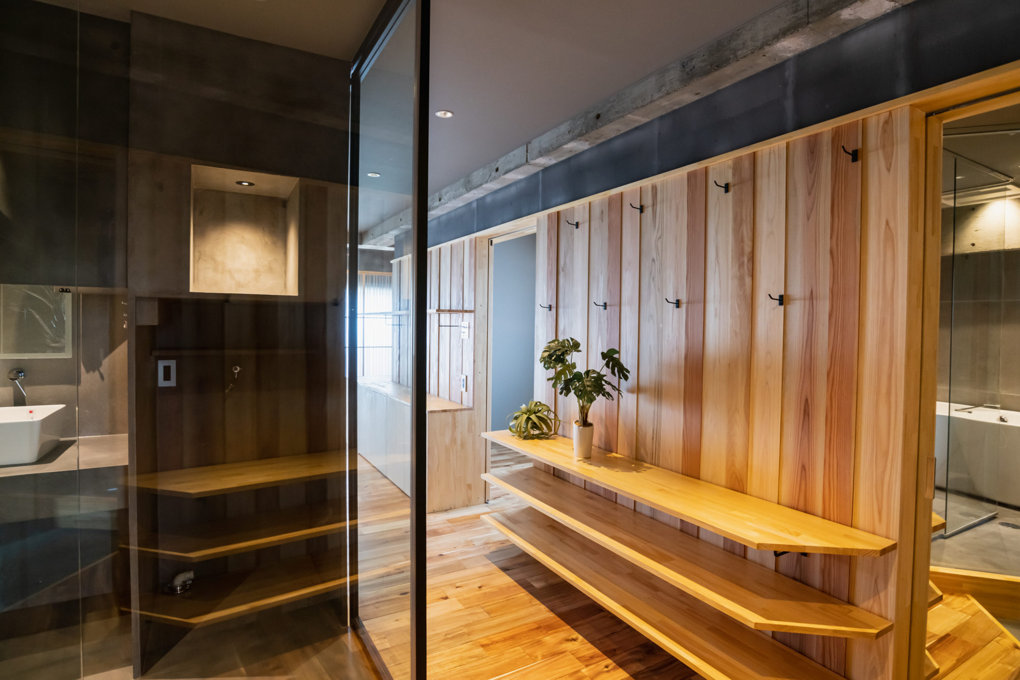 まず玄関を入ると、「フォレストウォール」と名付けた木の内壁が出現。