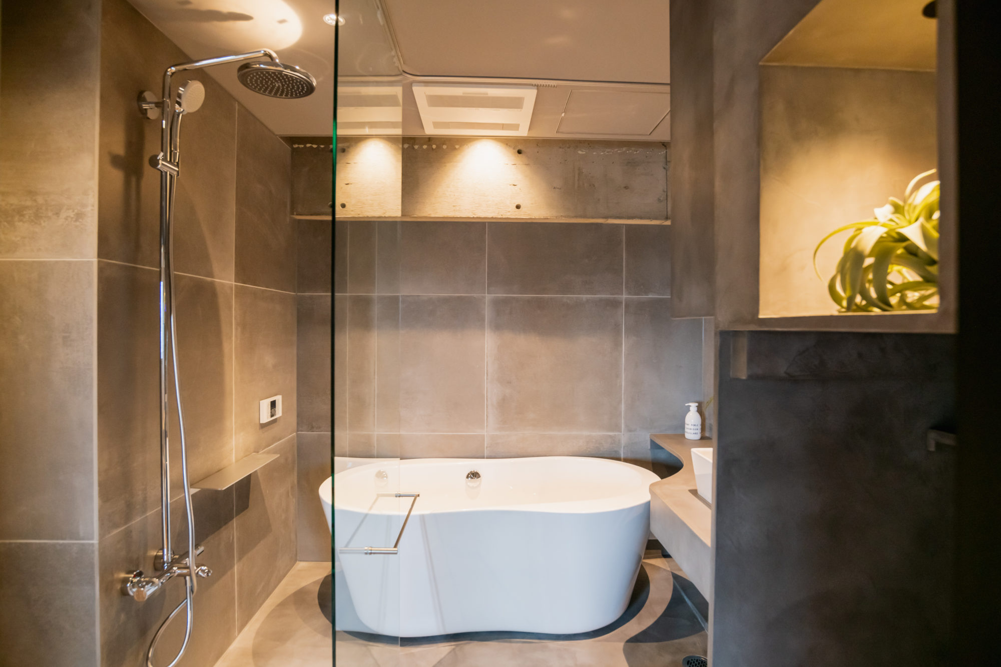 その左側にはバスルーム。広さやデザインに大変こだわりがありました。ユニットバスではなく、職人さんと何度も打ち合わせをして在来工法でつくりました。その甲斐あって、まるで高級ホテルのようなラグジュアリーな空間に仕上がっています。