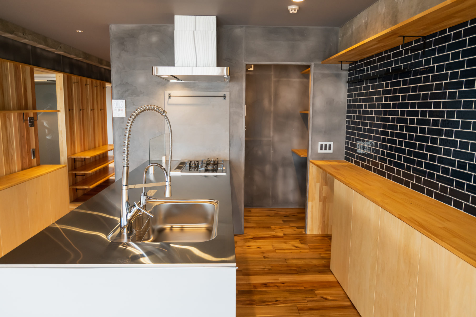 お客様から全体のイメージとして、「コンクリートの無機質な感じを残しつつ、木のぬくもりも融合させてほしい」というご要望がありました。そこで、キッチンはオールステンレスのものをチョイス。背面のネイビーのタイルも見事にマッチしています。奥にはしっかりパントリーも完備しました。
