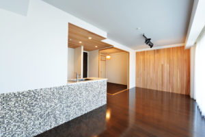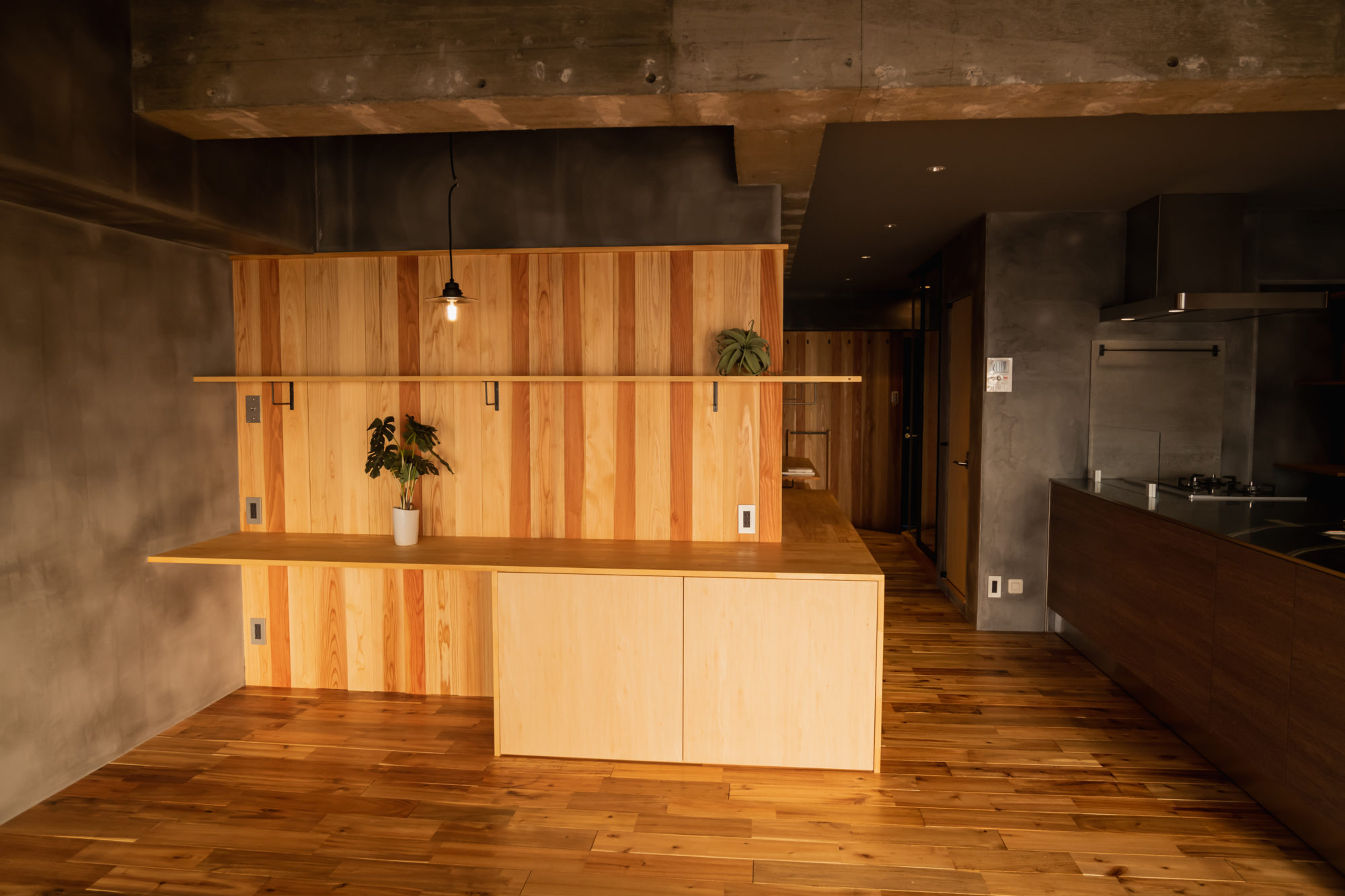 またフォレストウォールは玄関前だけでなくリビングにも続いており、木の爽やかな香りがお部屋に漂います。下段には扉をつけて、見せたい旦那様と片付けたい奥様、どちらのご意向も叶えられる収納デザインになりました。