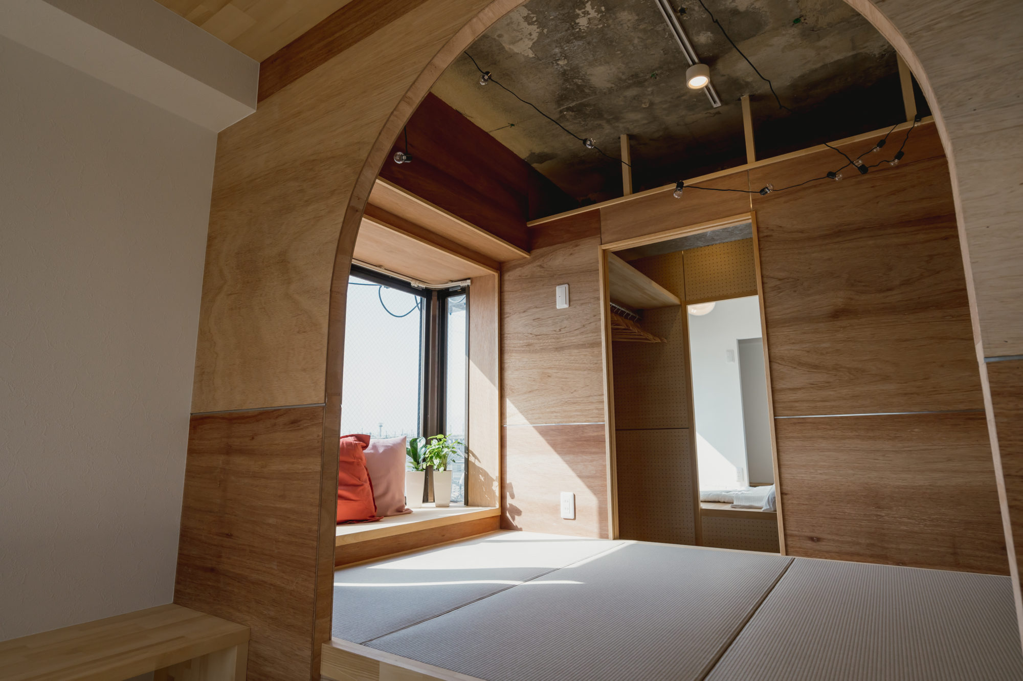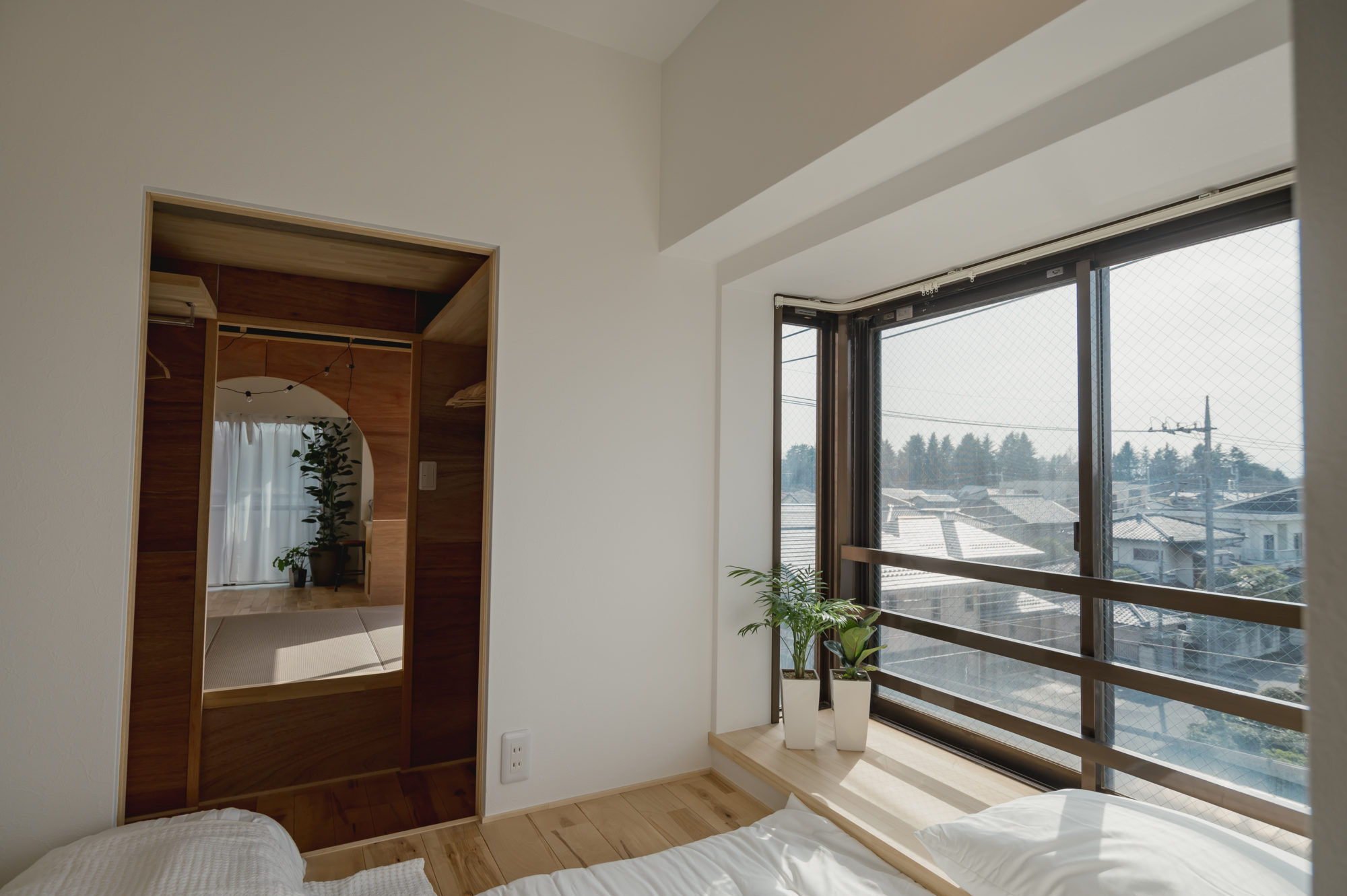 寝室スペースは二か所。リビングの隣は小上がりの畳部屋に。既存の窓の高さに床のレベルを合わせ、陽だまりの畳の上でくつろげる空間にしました。もう一か所は白を基調とした明るく開放的な空間に。夜は星や月明かりを楽しんだり、朝陽で目を覚ましたり、気持ちの良い1日の終わりとスタートが味わえそうです。