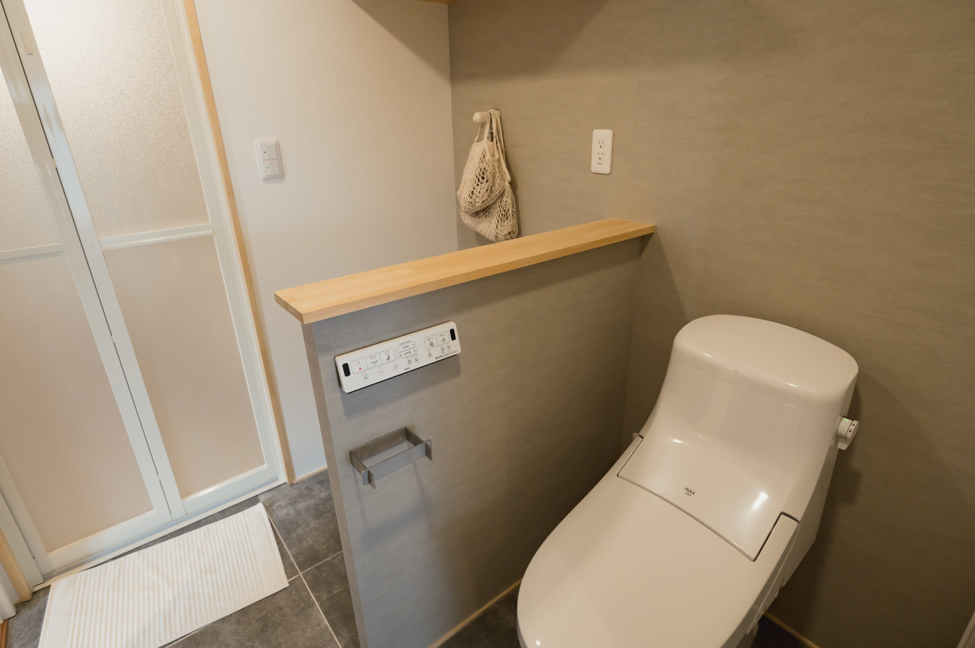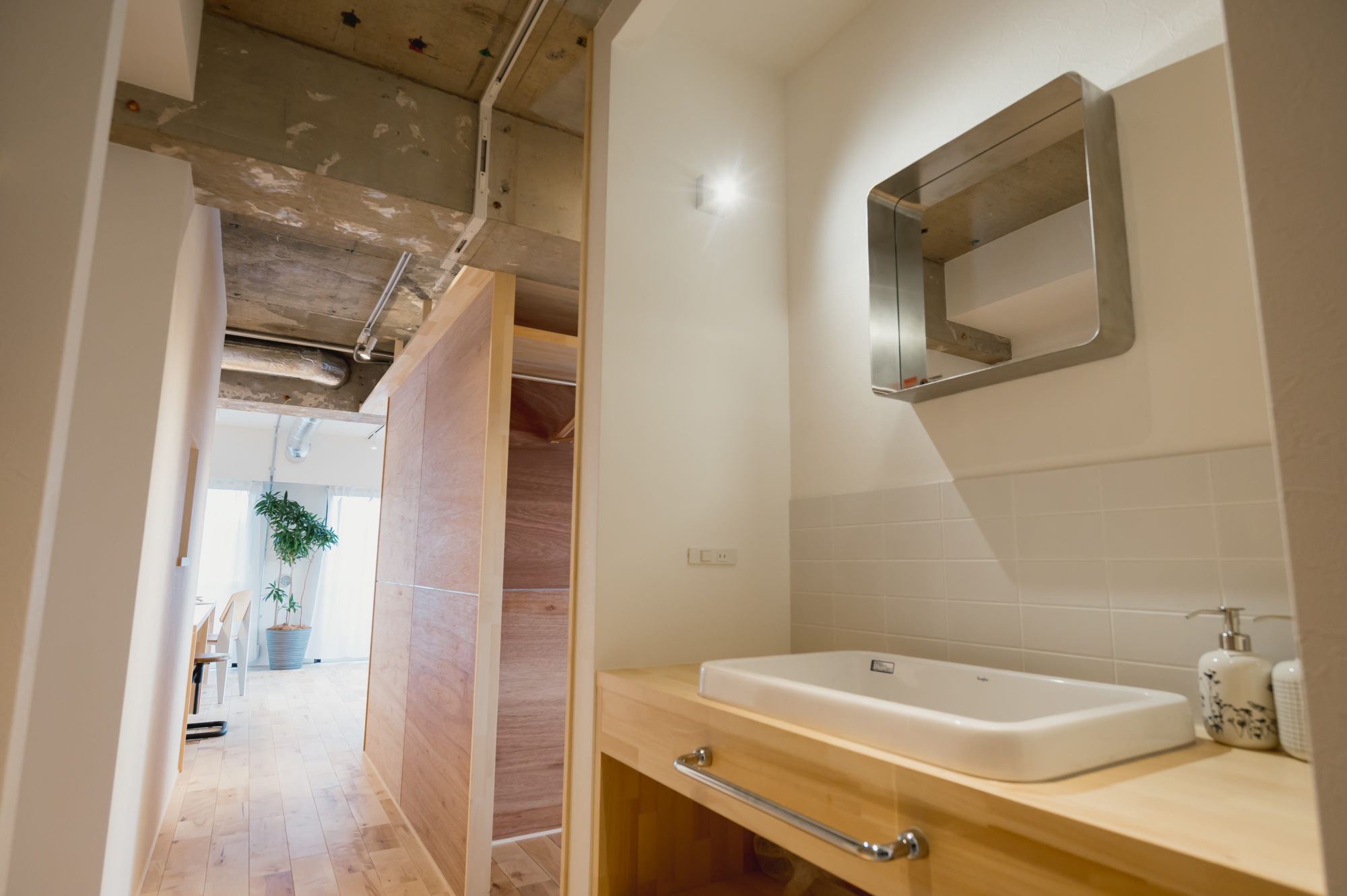 トイレ、お風呂、洗濯機置き場はキッチンから繋がっているので、家事動線がスムーズ。洗面台は玄関からリビングに行く途中の廊下に設置したので帰宅後すぐに手洗いができるので便利です。