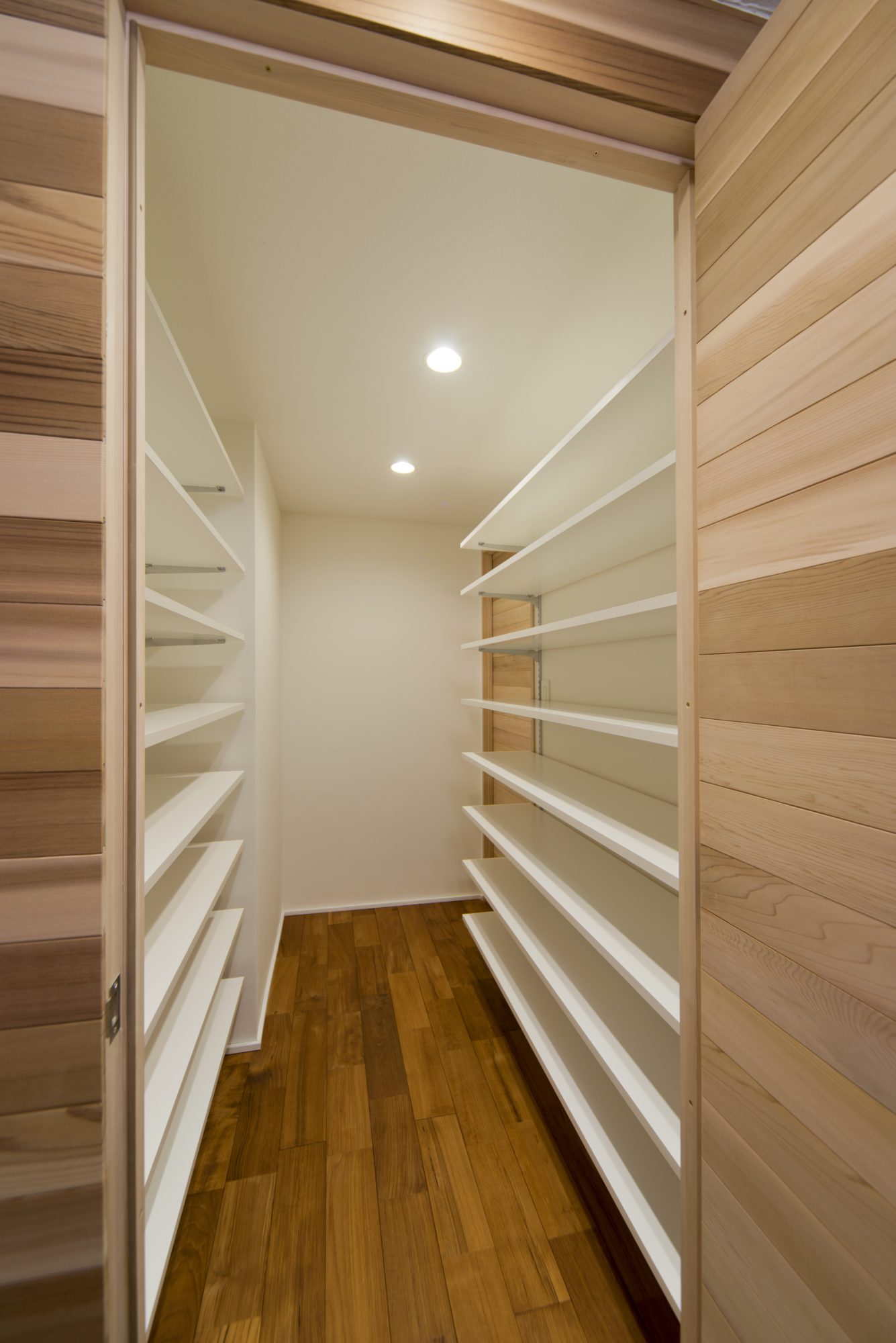 レッドシダーをパネリングして印象的な玄関にしました。シューズインクロークもスペースが広く、十分に収納も可能です。玄関は狭い空間の中でも明るい印象になるようにレッドシダーの色のトーンも工夫しています。