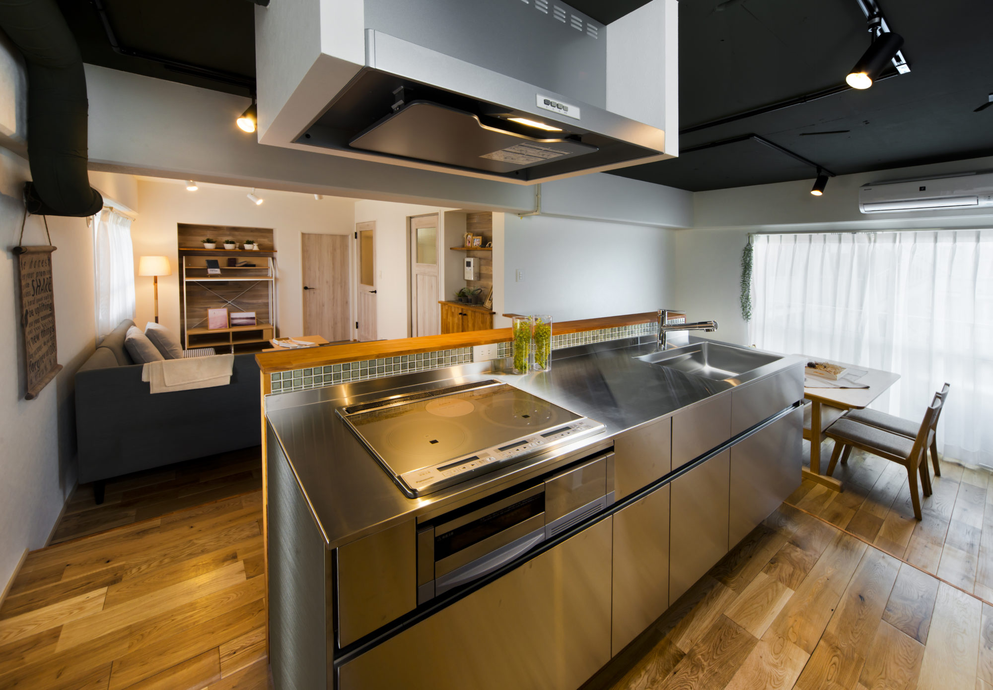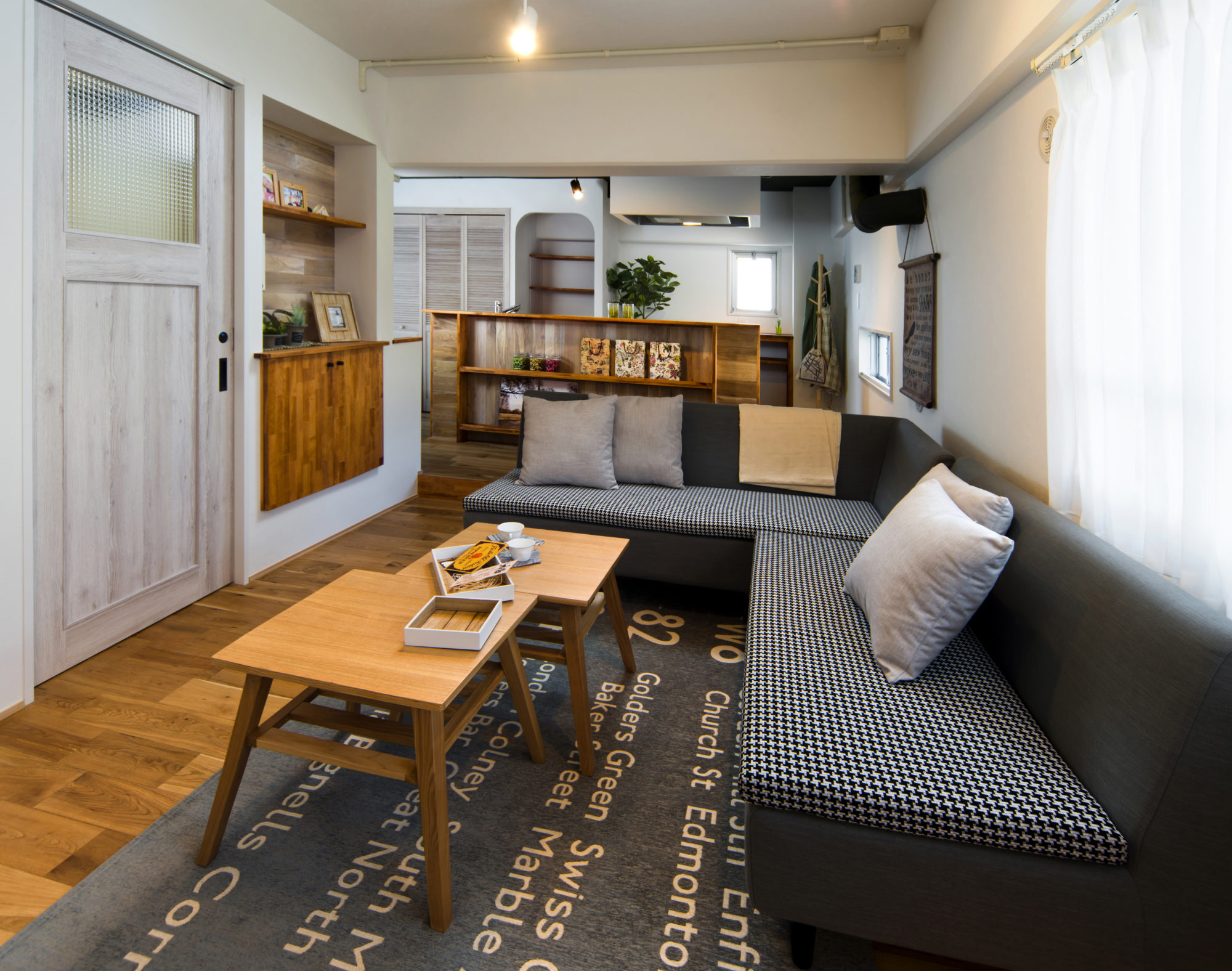 LDKの奥にあった和室を無くし、スペースを合わせて大きなL字のLDKへと間取りを変更しました。また洗濯機置き場を洗面ではなくキッチン横に設置することで、キッチン・洗濯機・パントリーが横並びとなり、リビング全体を視界に入れられる場所で、一箇所でまとめて家事ができるようになりました。
