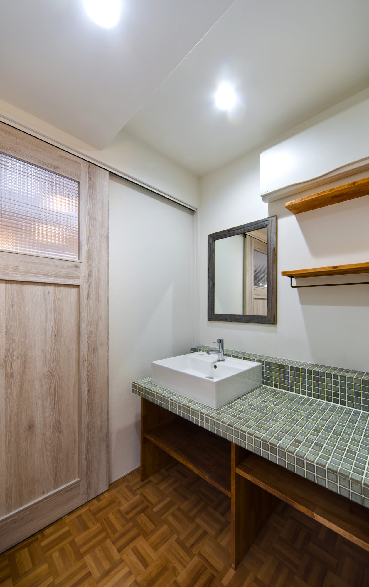 洗面は、水濡れに強く耐久性もあるタイル張り。ここでもアクセントにグリーンを使用しています。玄関は床を斜めにカットすることで空間を有効活用し収納スペースをたっぷり確保しました。