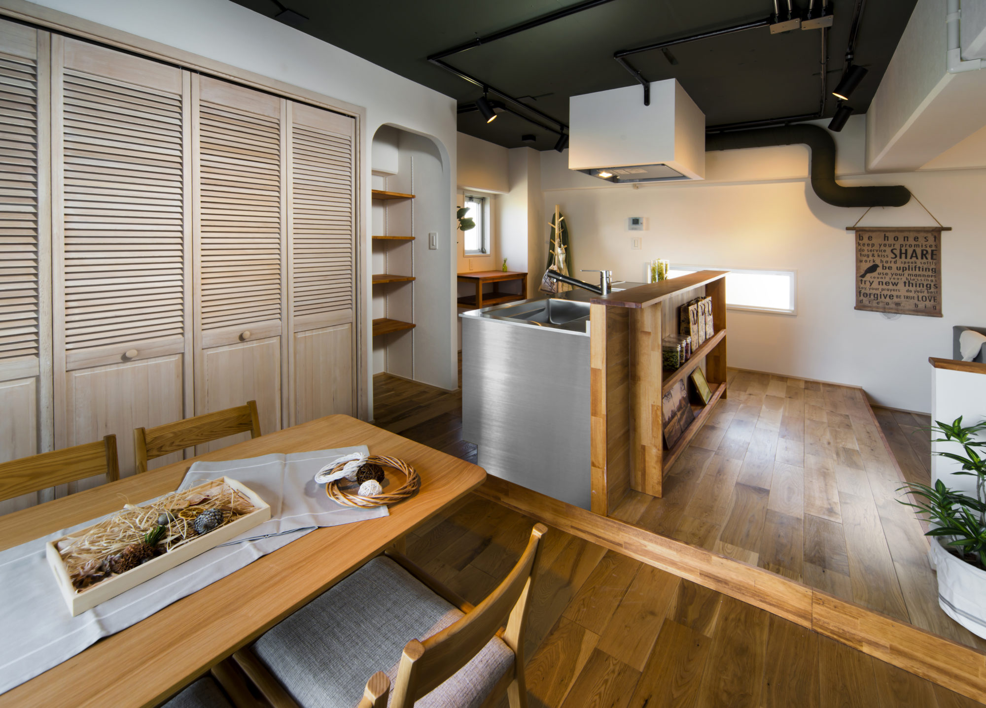 また、キッチン・ダイニング・リビンをそれぞれ建具ではなく高低差でスペースを仕切り、開放感のある広く感じる空間に仕上げました。