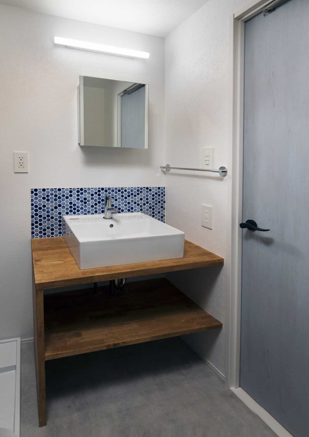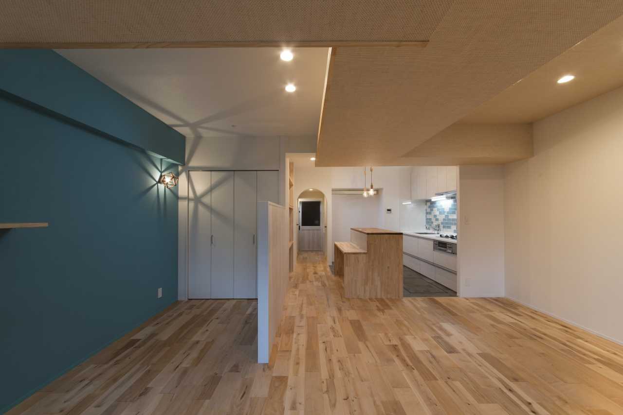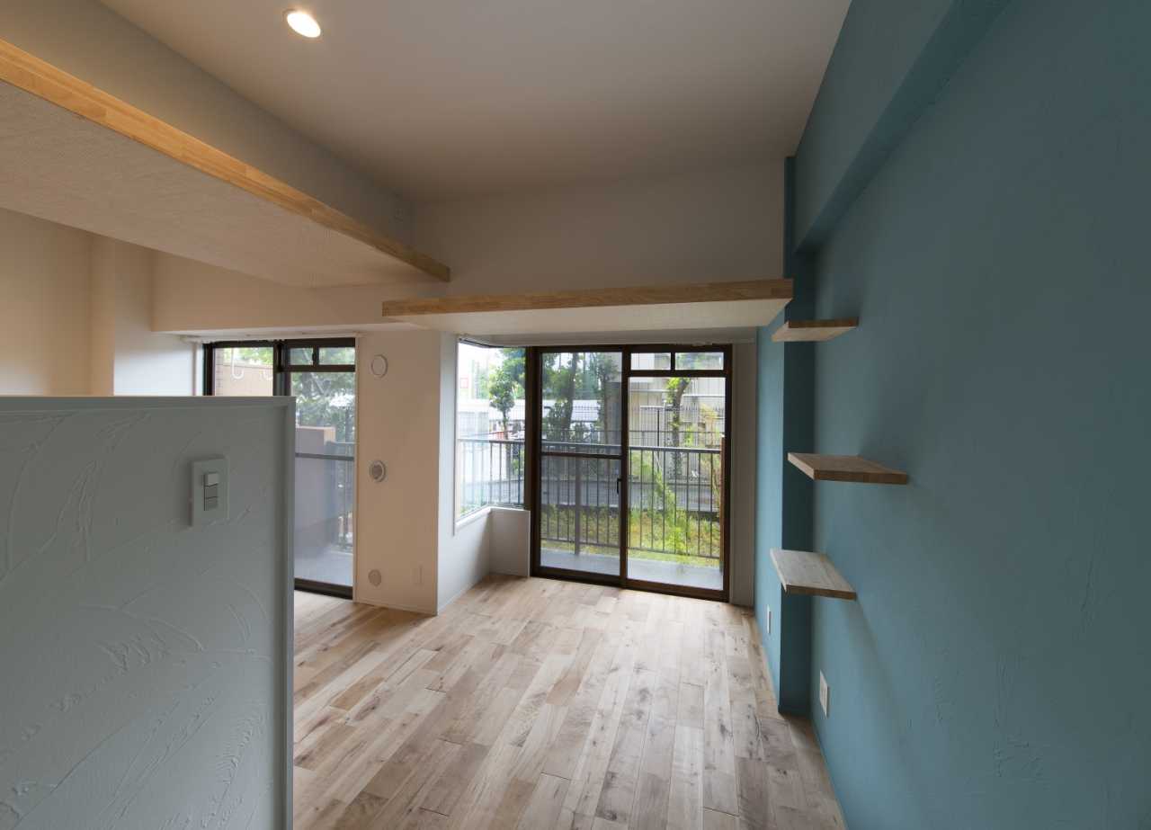 スノーエイジング塗装をした間仕切りの向こう側には、アクセントカラーとなるブルーを配色。空間の爽やかさを引き立てています。