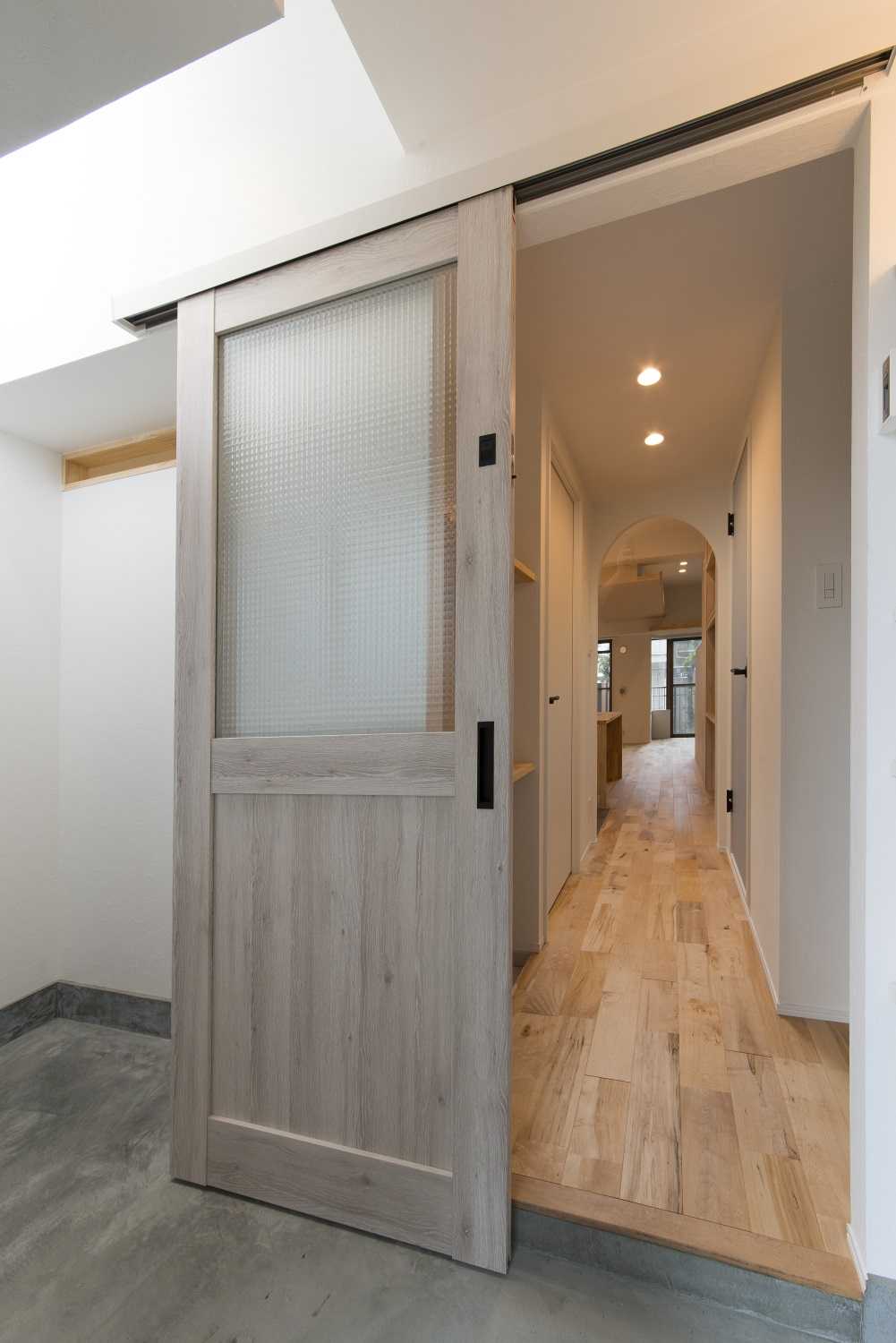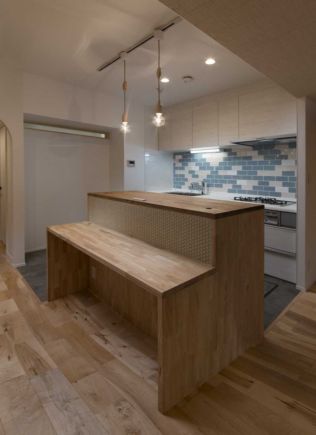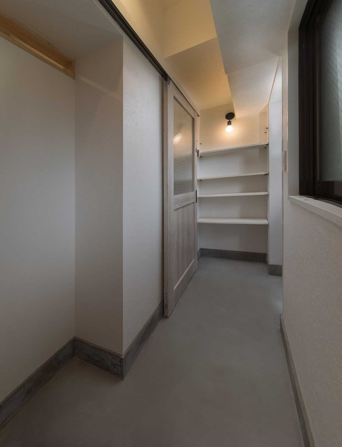 スノーエイジング塗装をした間仕切りの向こう側には、アクセントカラーとなるブルーを配色。空間の爽やかさを引き立てています。