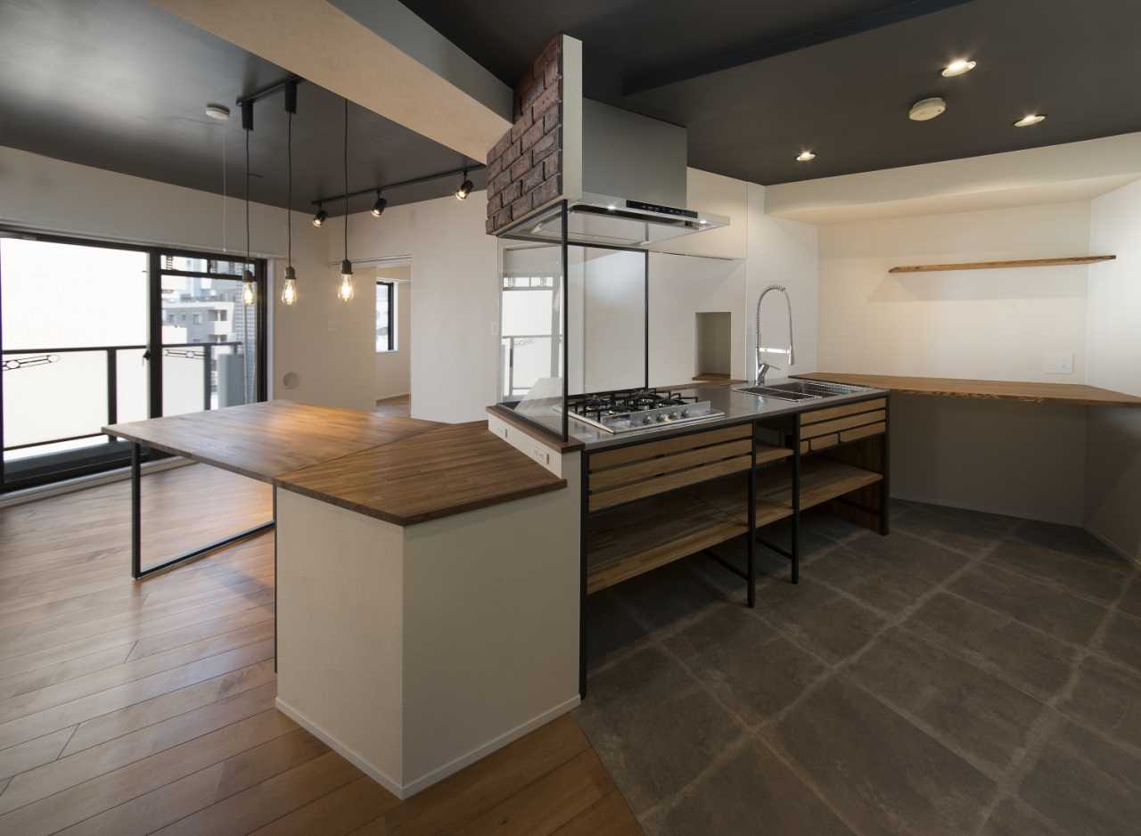 インパクトのある大きなダイニングテーブルは、生活導線を確保しつつキッチンと一続きにすることで、作業領域が広がるデザイン。