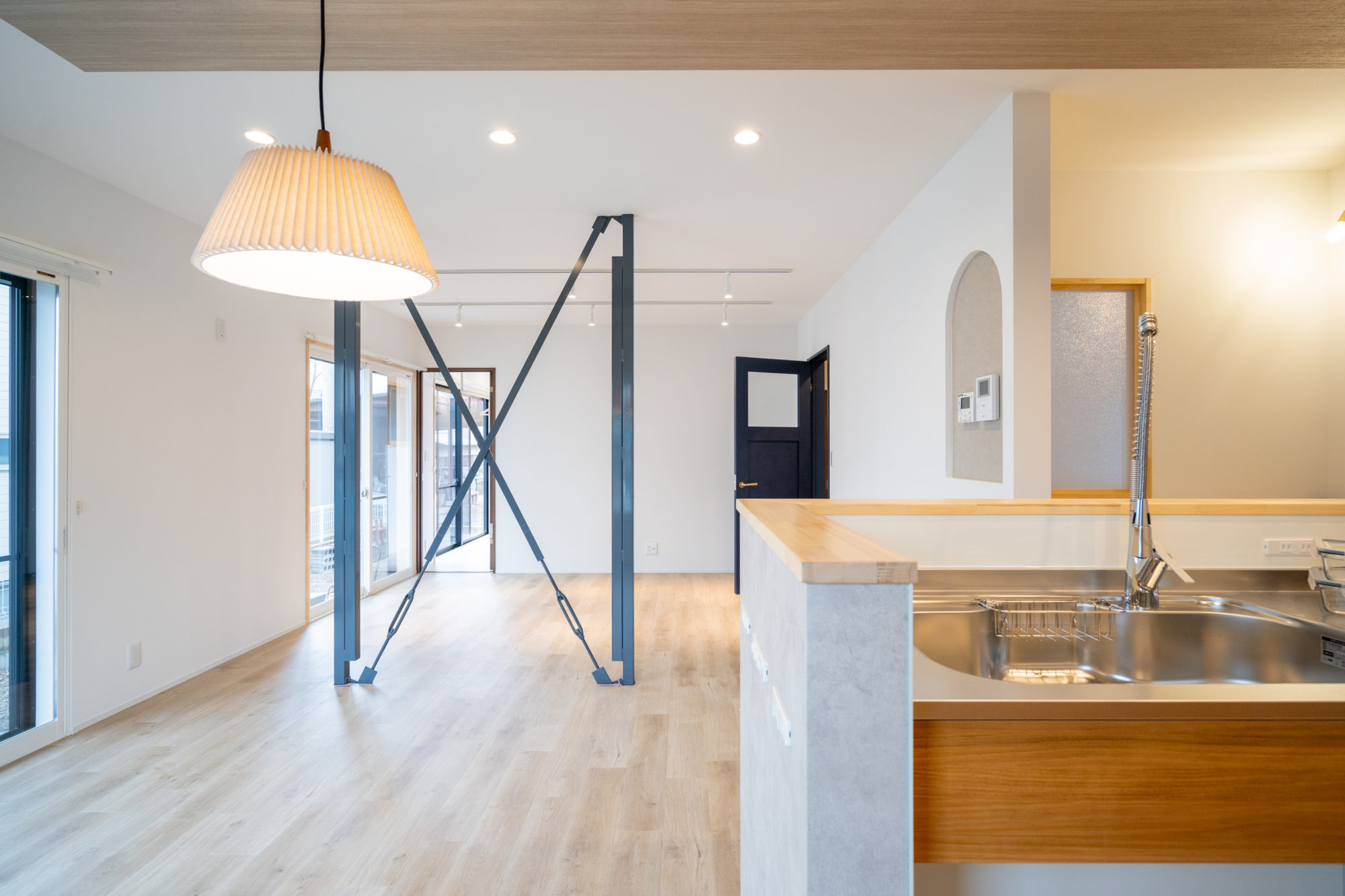 和室をリビングに取込むことで、広く明るく開放的なLDKに。 もちろん壁を撤去する前に、筋交いや梁の位置を確認し構造的な安全性もチェック済みです。今回は、壁を撤去して筋交いを見せることで空間を広く感じさせるだけでなく、木のぬくもりと鉄骨の異素材ミックスでデザイン性もアップしています。