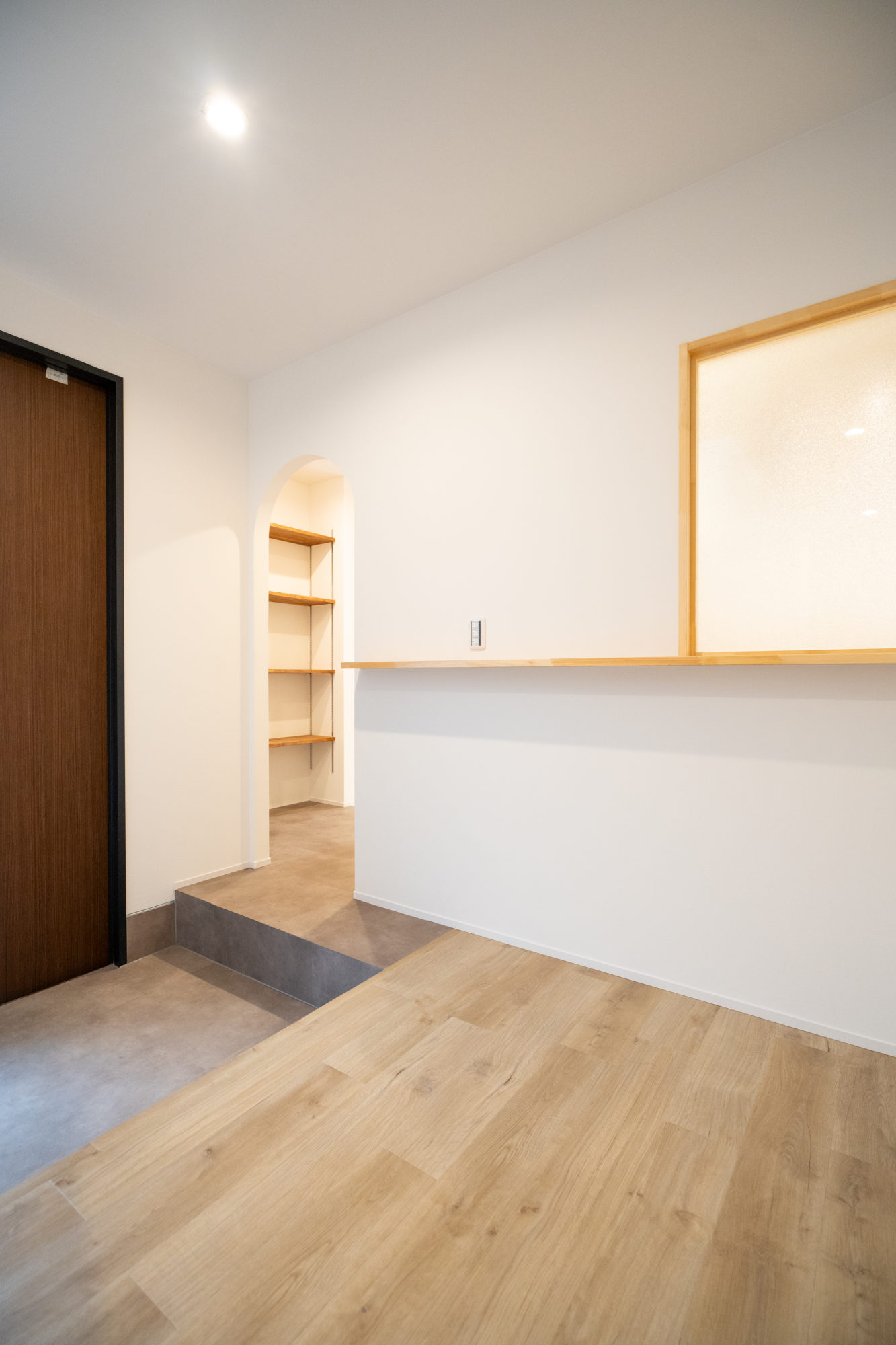 玄関収納を撤去してシューズクローゼット新設。買い物帰りはシューズクローゼット→パントリー→キッチンへ直行。来客時は玄関→ホール→リビングと動線が使い分けられます。