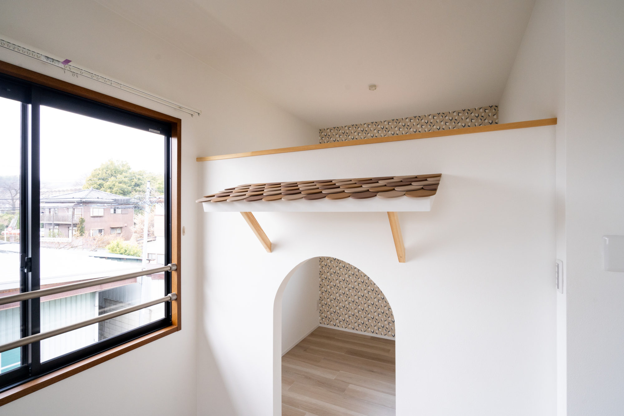 2階のキッチンは解体後してキッズスペースに変更。子どもサイズにしたアーチ型の出入口で特別感も高まります。「オリジナルの室内屋根」は、うろこ状にカットした板を1枚1枚塗装し、色の配置もこだわりながら造作してあります。