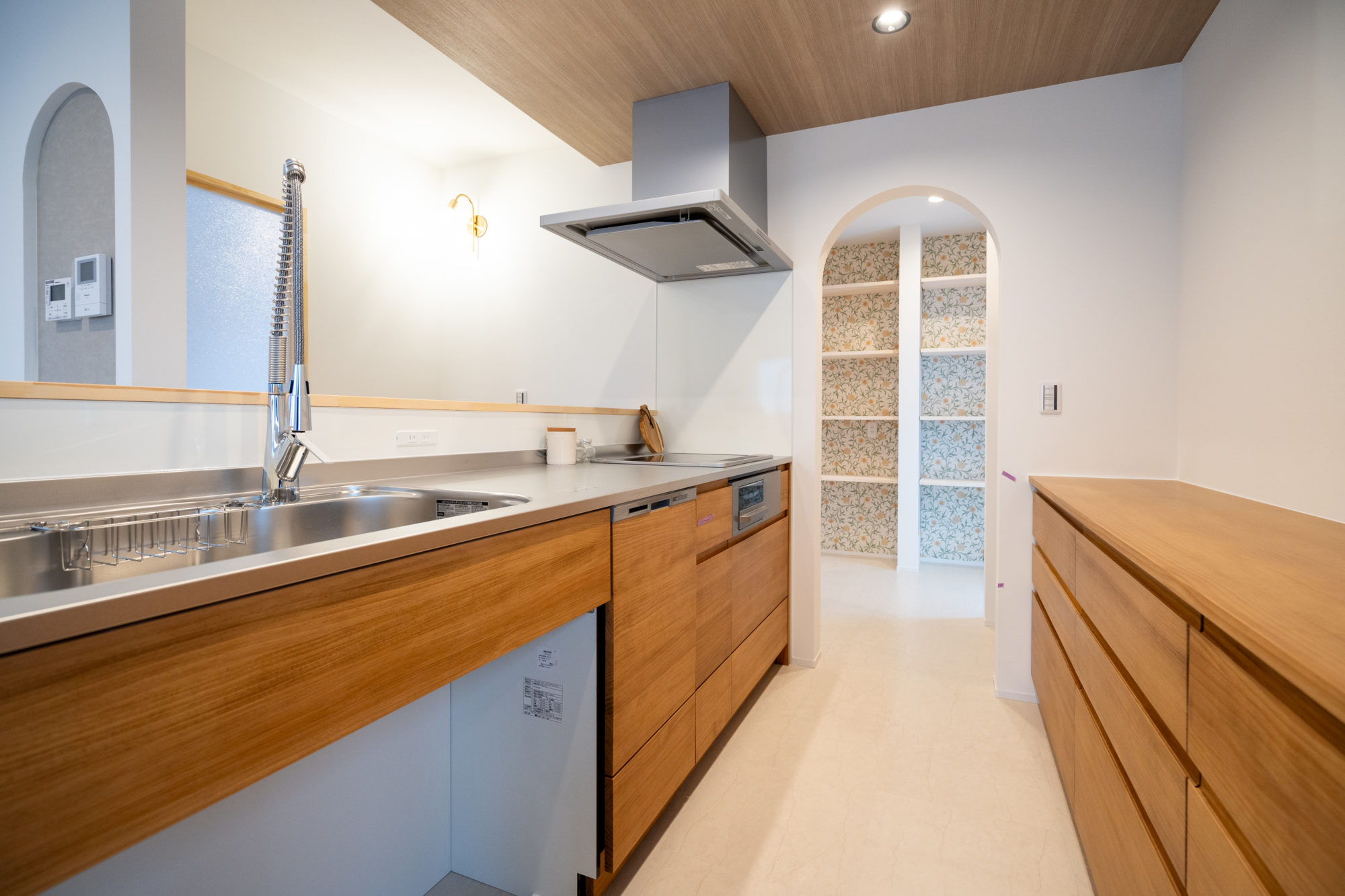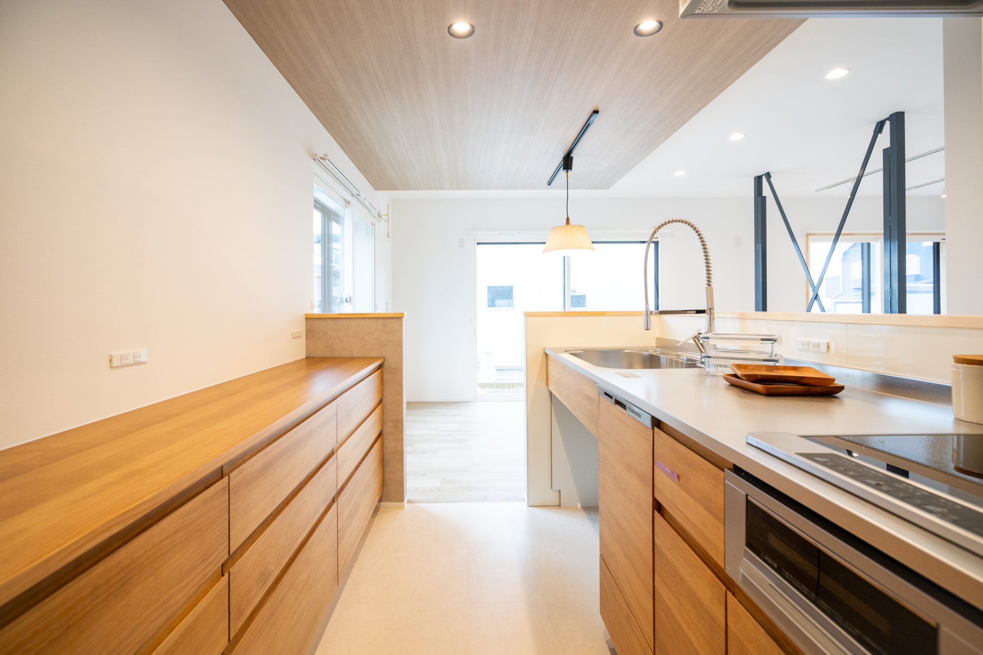シンク下はゴミ箱置き場なので、生ゴミもサッと捨てられます。木目調の下がり天井&無垢のキッチンはぬくもりがあり、毎日のごはん作りも心躍る空間になります。